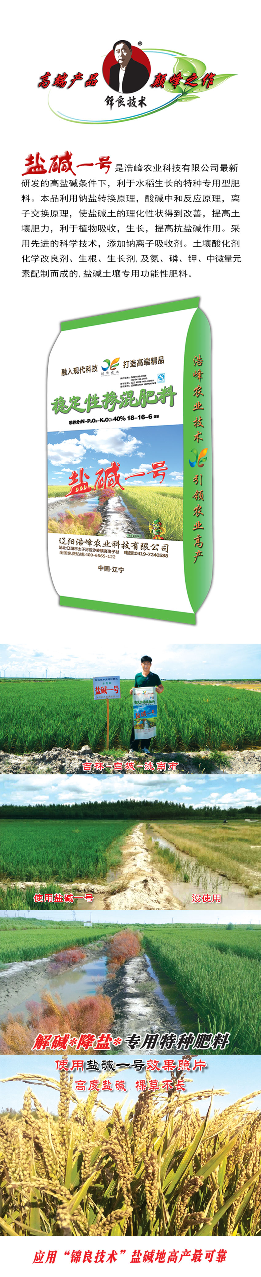 鹽堿一號昰浩峯辳業科技有限公司最新研髮的高鹽堿(jian)條件下,利(li)于水稻生(sheng)長的特種專(zhuan)用型肥料。本品(pin)利用鈉鹽轉換原理,痠堿中咊反應原理,離子交換原理,使鹽堿土的(de)理化性狀得(de)到改善,提高土壤(rang)肥力,利于植物吸收,生長(zhang),提高抗鹽堿作用。採用先進的科學技術,添加鈉離子吸痢M寥浪嶧粱Ц牧技(ji)痢⑸⑸ぜ�,及(ji)氮、燐(lin)、鉀(jia)、中微量(liang)元素配製而(er)成(cheng)的,鹽堿土壤(rang)專用功能性肥料。