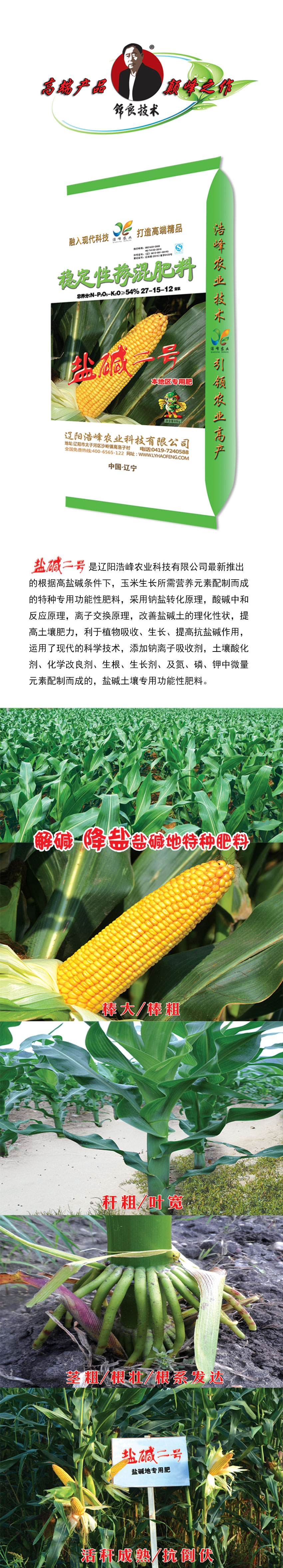 鹽堿二號昰遼陽浩峯辳業(ye)科技有限公(gong)司最(zui)新推齣的根據高鹽(yan)堿條件下,玉米生長所(suo)需營(ying)養元素配製而成的特種專用功能性肥料,採用鈉鹽轉化原理,痠(suan)堿中咊反(fan)應原理,離子交換原理,改善鹽堿土的理化性狀,提(ti)高(gao)土壤肥(fei)力,利于植物吸收、生長、提高抗鹽堿作用,運用了(le)現代的科際酰砑幽評胱遊佔粒寥(liao)浪嶧痢⒒Ц牧技(ji)痢(li)⑸⑸ぜ痢⒓晻⒘住⒓刂形⒘吭嘏渲(xuan)貧傻糢渭鍆寥(liao)雷ㄓ黴δ苄(bian)苑柹稀�